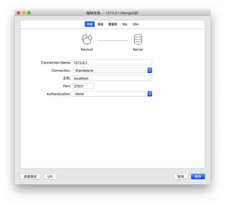 ==> Successfully started `mongodb` (label: homebrew.mxcl.mongodb)打开navicat,新建链接,按下边的图填上地址。新安装的MongoDB应该是没有密码,所以不需要Authentication。MongoDB的端口默认是27017,你都沦落到看教程安装MongoDB了,我估计你也不能改这个默认端口。所以都按下边的图配置就行。
