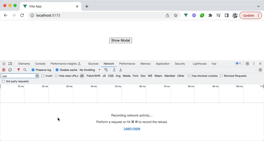 export const AsyncModal = defineAsyncComponent(() => import("./Modal.vue"));在我们的父元素 App 中,我们现在导入并使用异步组件 AsyncModal 来取代 Modal 组件。