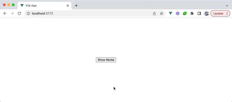 </style>在父组件 App 中,我们渲染 modal 和一个按钮。当按钮被点击时,通过一个布尔类型的值(showModal)来切换 modal 的显示。modal 的显示与否基于响应式数据 showModal。