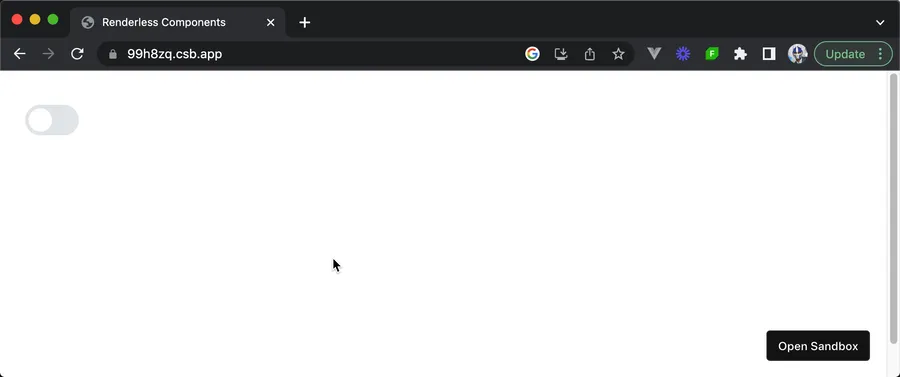 在父组件中,我们来尝试渲染三个不同的切换组件,每个组件都具有各自独特的表现。我们首先导入前面创建的无渲染组件 ToggleComponent。